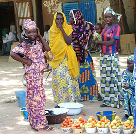 An der Kleidung dieser Straßenverkäuferinnen, die ihre ordentlich aufgestapelten Früchte anbieten, zeigt sich die Vielfalt der Stoffe. (Foto: Werdermann)
