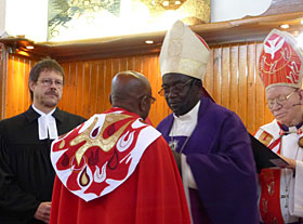 Einsegnung von Bischof Ernst //Gamxamub durch Bischof Dr. S.V.V. Nambala und Bischof em. Dr. Z. Kameeta assistiert von Oberkirchenrat Christoph Pistorius (jetzt Vizepräses der Evangelischen Kirche im Rheinland)