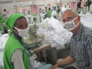 In dieser Fabrik in Äthiopien wurden T-Shirts für KiK produziert. Vom Verkaufspreis (3 Euro) eines Shirts bekommt diese Näherin gerade mal 0,38 Cent, wie Dietrich Weinbrenner (rechts) gerechnet hat. (Foto: Privat)