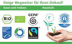 Bei der Orientierung im Siegel-Dschungel helfen die Verbraucherinitiative und „Zukunft einkaufen“, ein Projekt zur ökofairen Beschaffung in Kirchen. Die Umwelt schonen zudem diese Öko-Label und -Produkte: Biosiegel, Blauer Engel und Eco-Top-Ten.